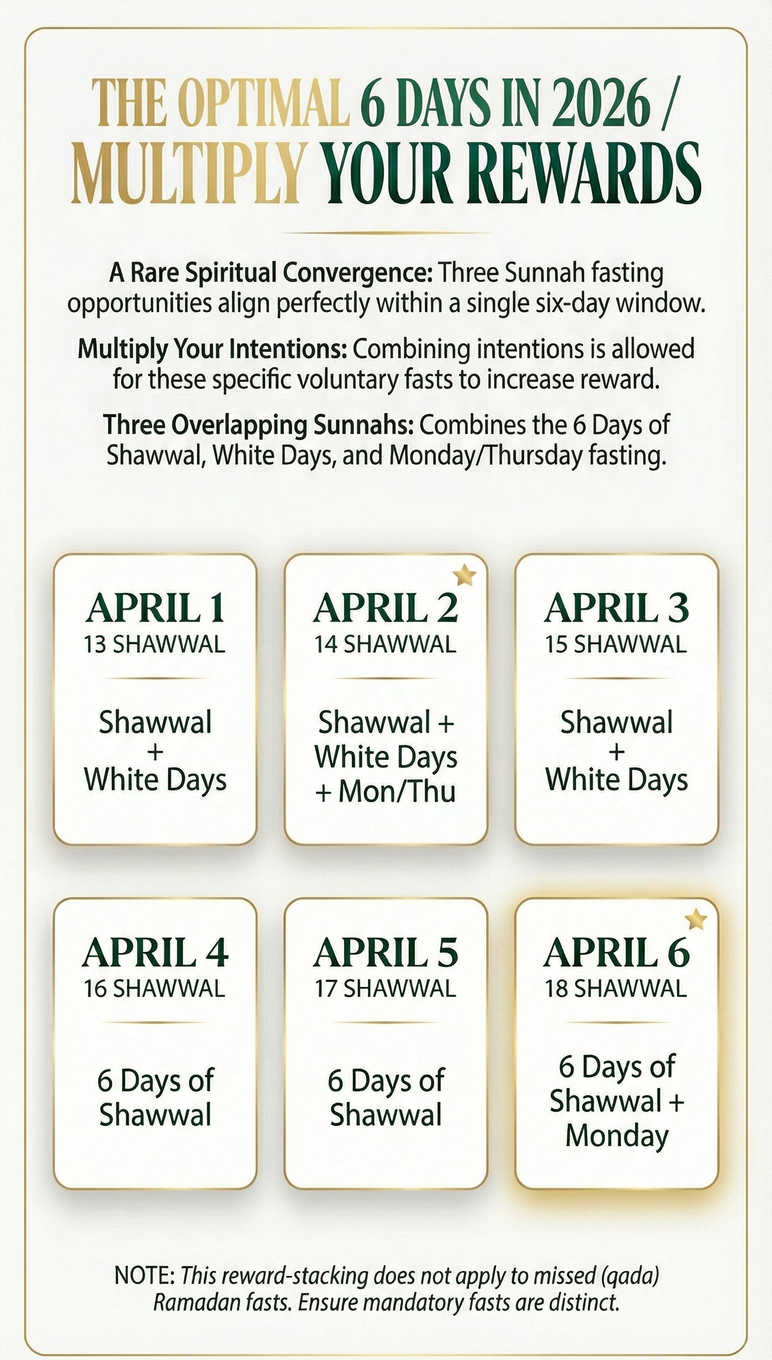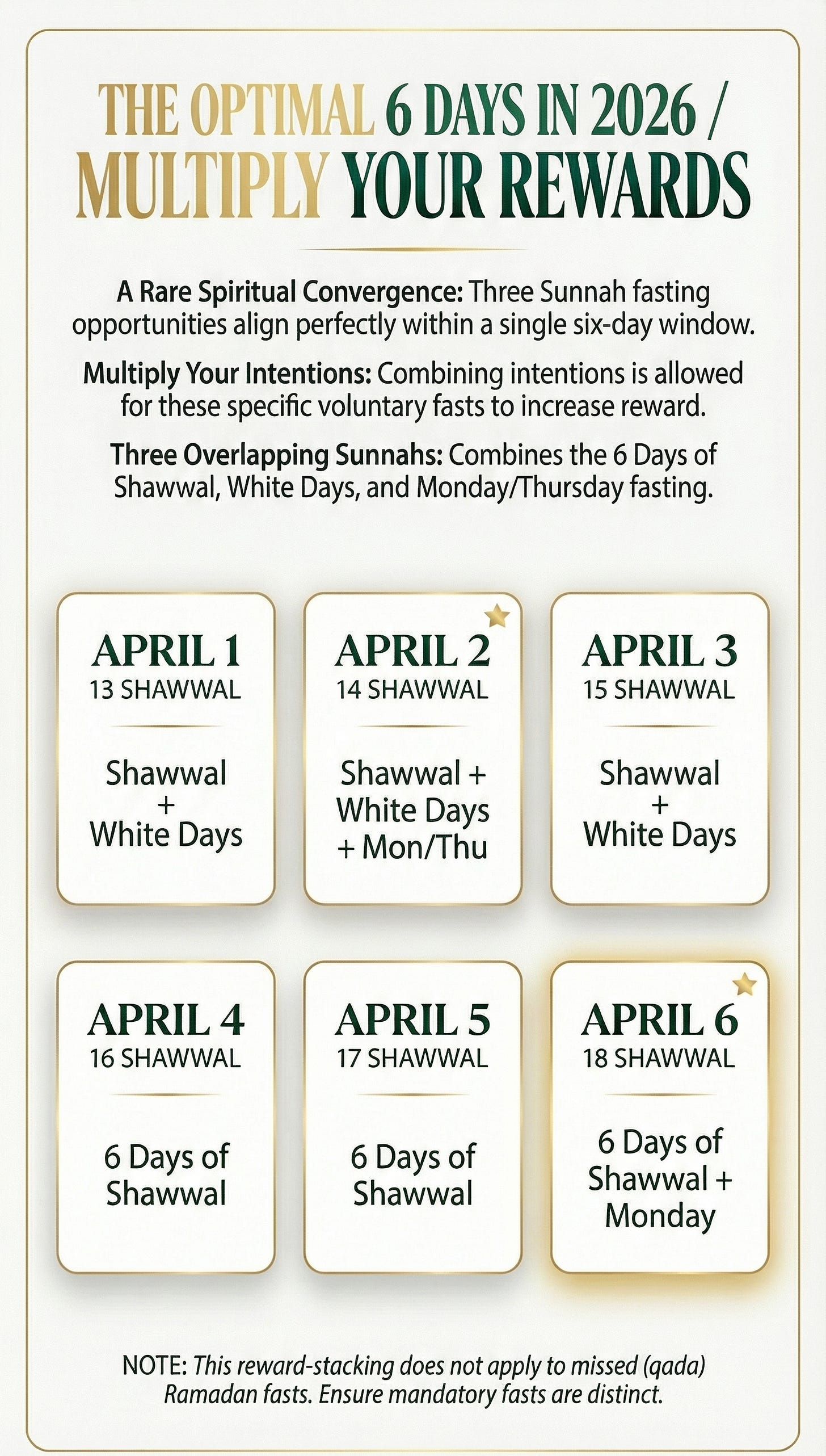Based on the calendar being followed in this article, one especially meaningful window falls from April 1 to April 6, 2026. In that stretch, the six days of Shawwal can overlap with the White Days and with Monday or Thursday fasting.[5][6]