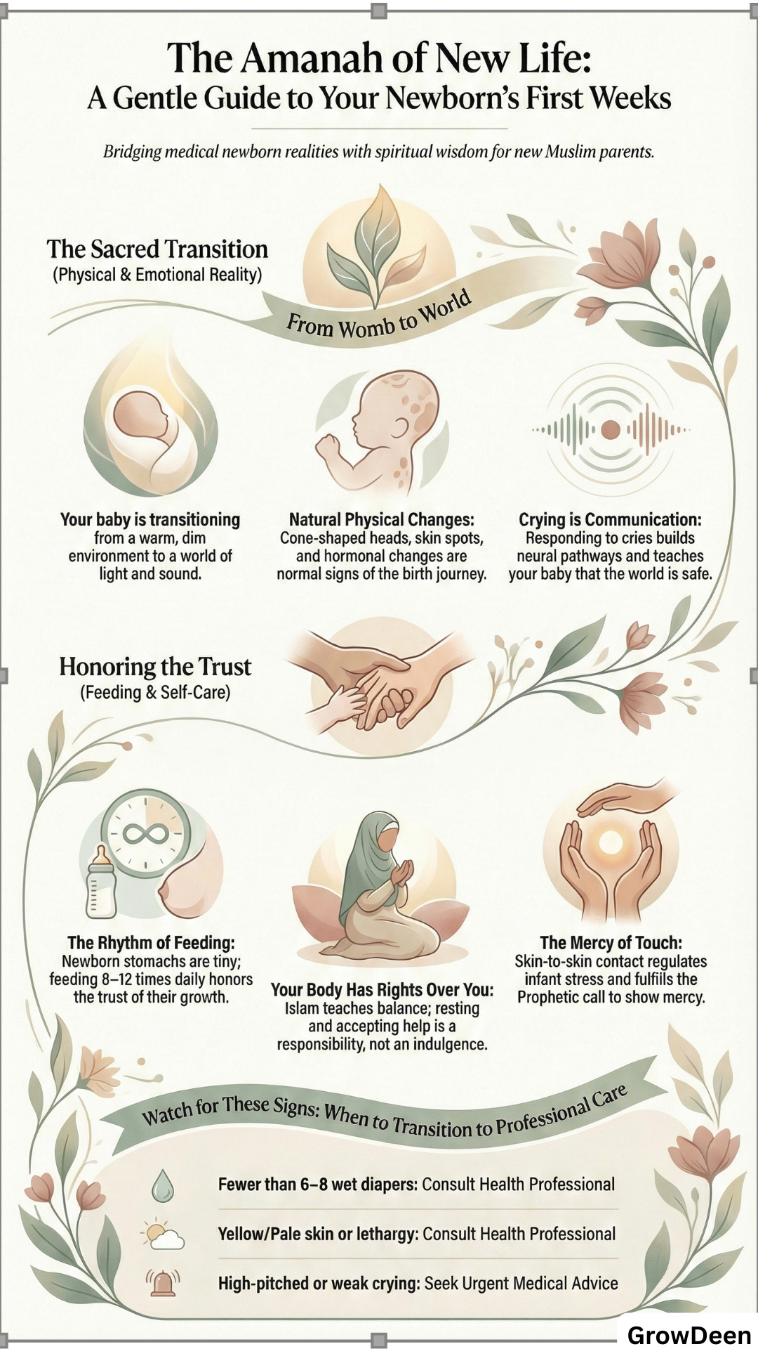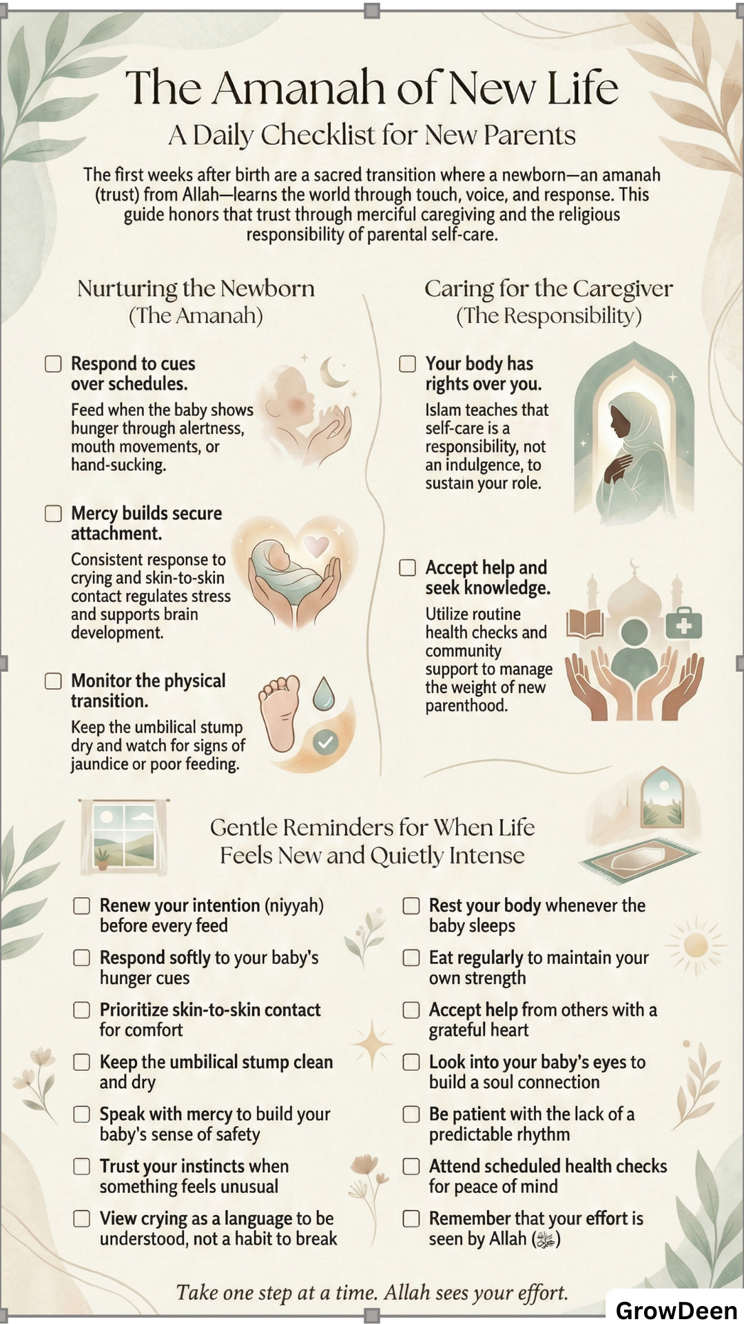 The Prophet ﷺ taught that the one who does not show mercy to the young is not from us [12]. In the newborn stage, mercy often looks like you, exhausted, choosing gentleness anyway.