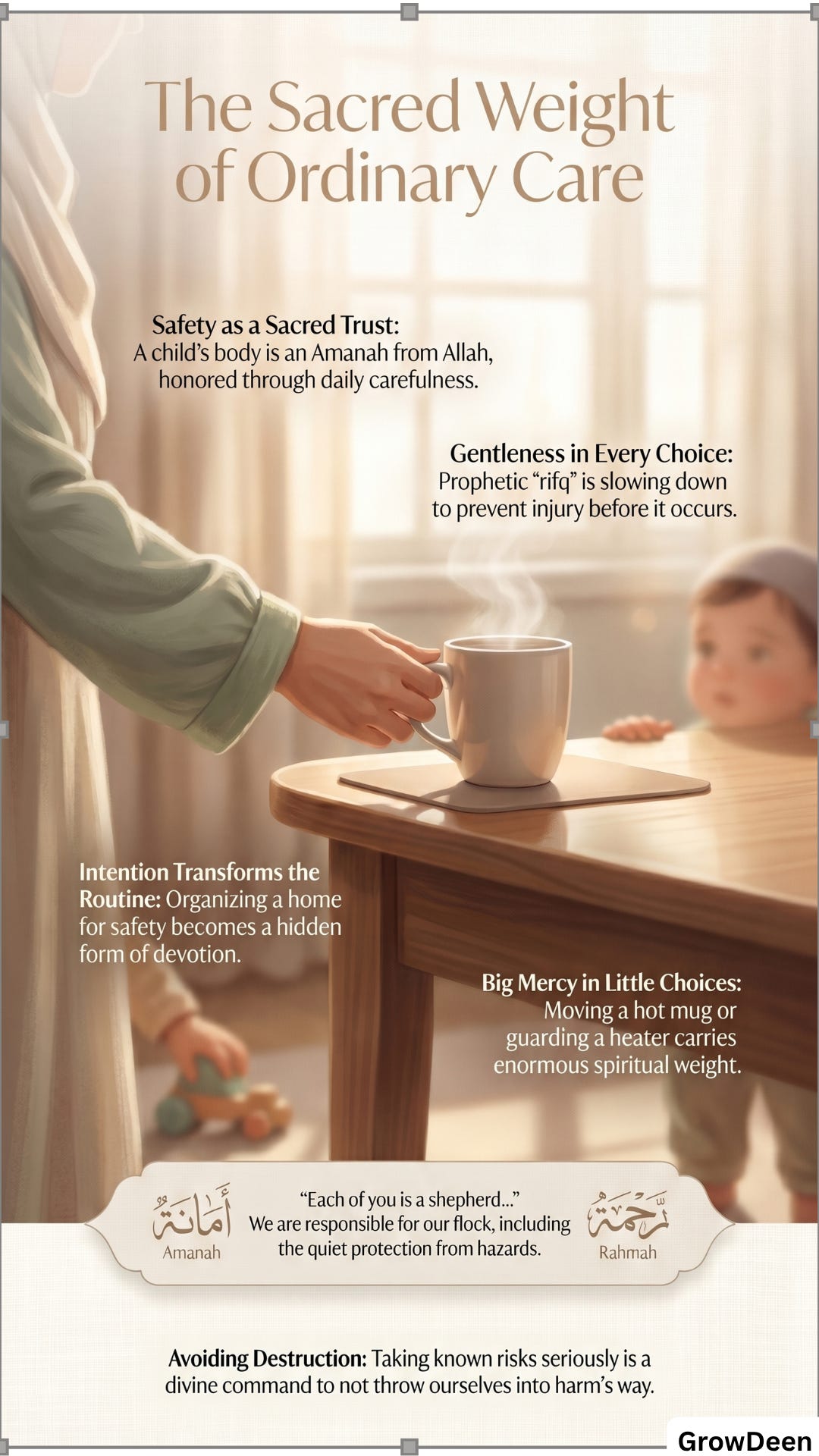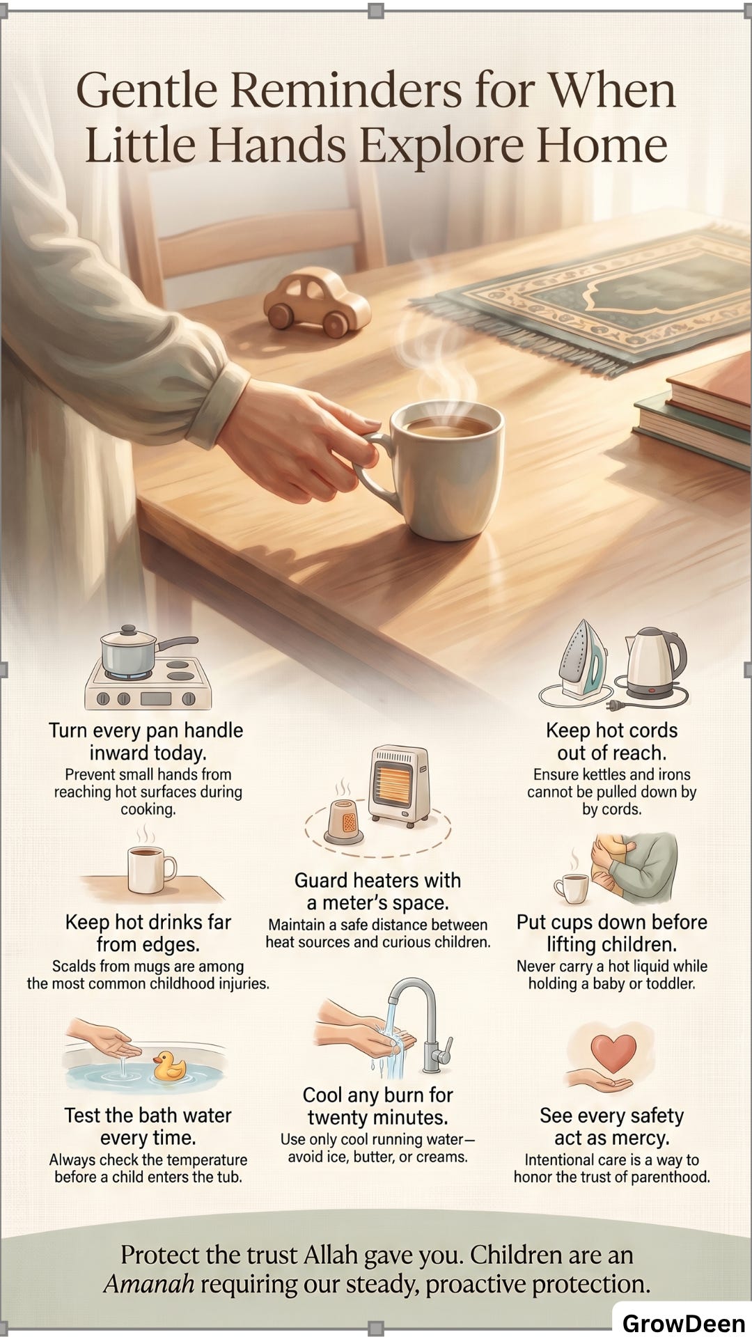 A child’s body is a trust from Allah, and ordinary household safety is part of how that trust is honored. Allah says, “Indeed, Allah commands you to render trusts to whom they are due.” [15]