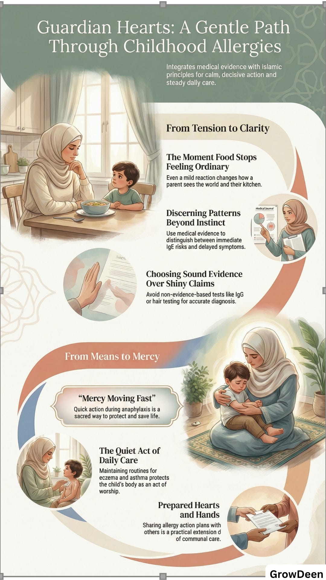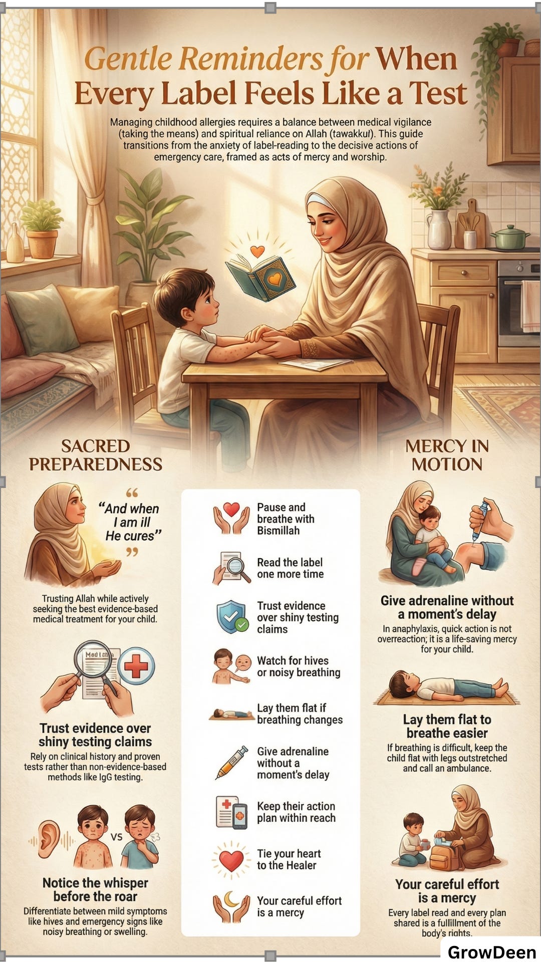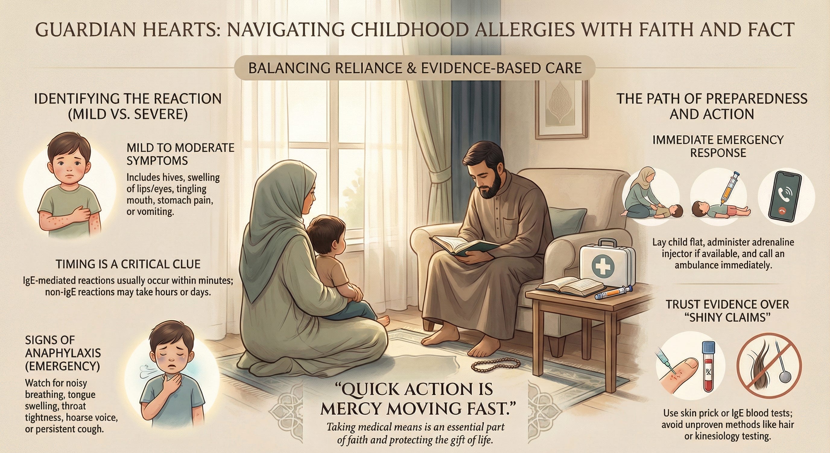 Good allergy care is not built on panic. It is built on attention, evidence, preparation, and mercy. Notice the pattern. Get proper assessment. Use trustworthy tests. Treat the milder reactions properly. Move fast in anaphylaxis. Keep the action plan updated. Teach the people around your child. And while your hands do all that work, keep your heart tied to Allah.
