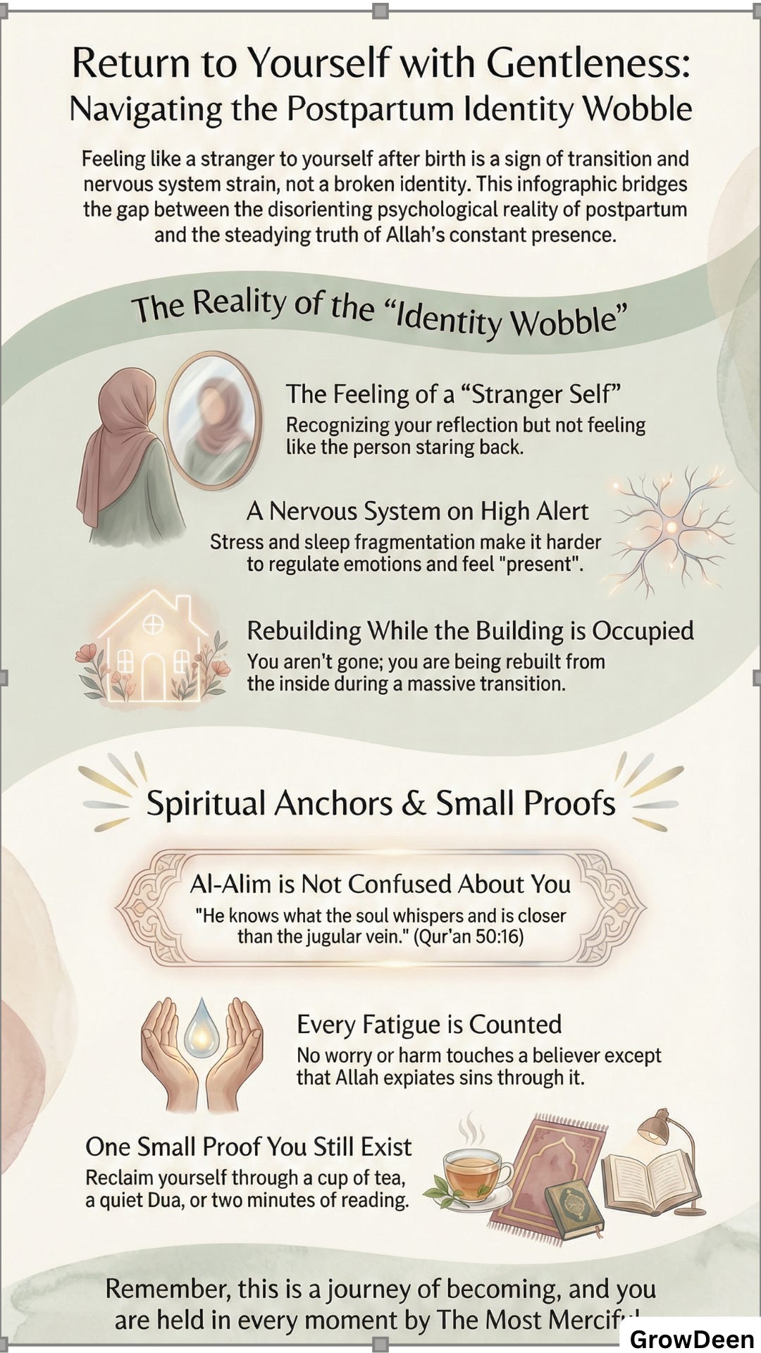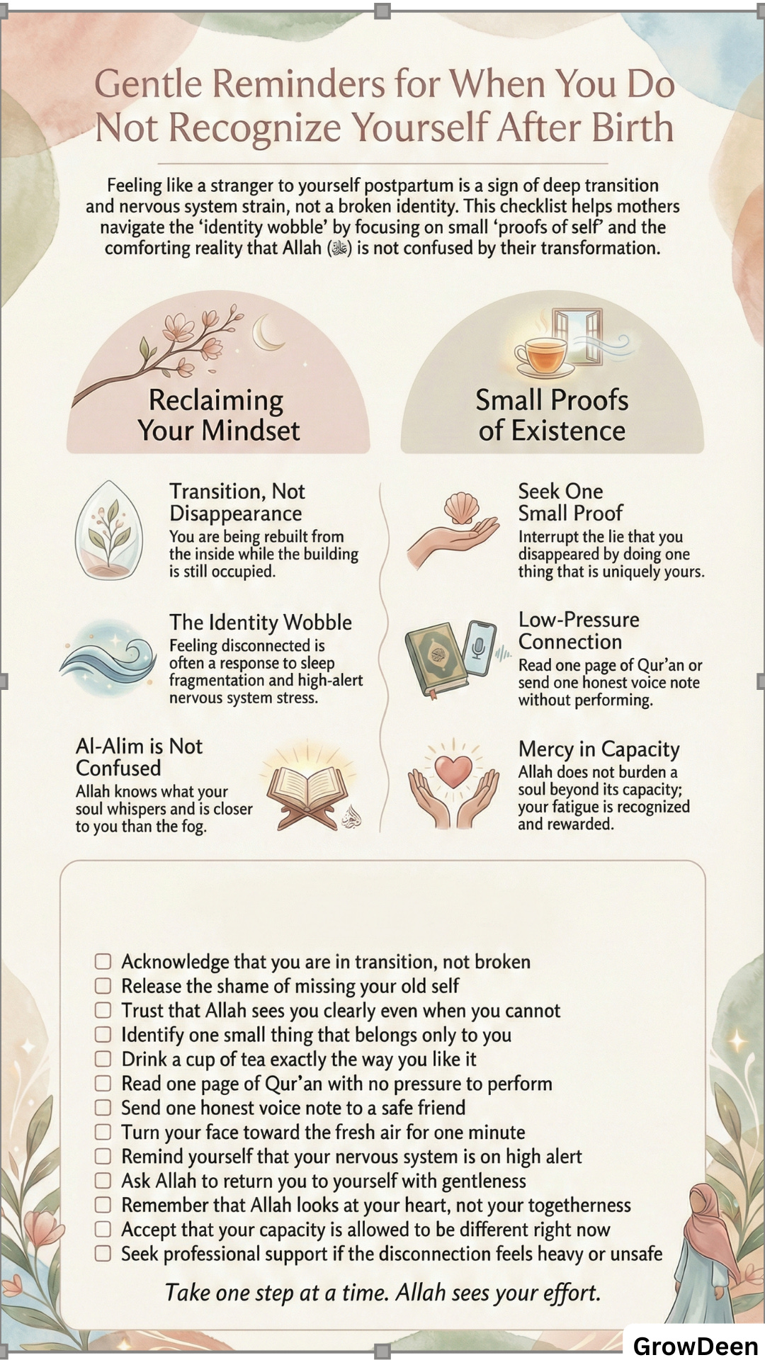 Feeling like a stranger to yourself three months postpartum is often a sign of deep transition and nervous system strain, not a broken identity, and Allah sees you clearly even when you cannot recognize you.