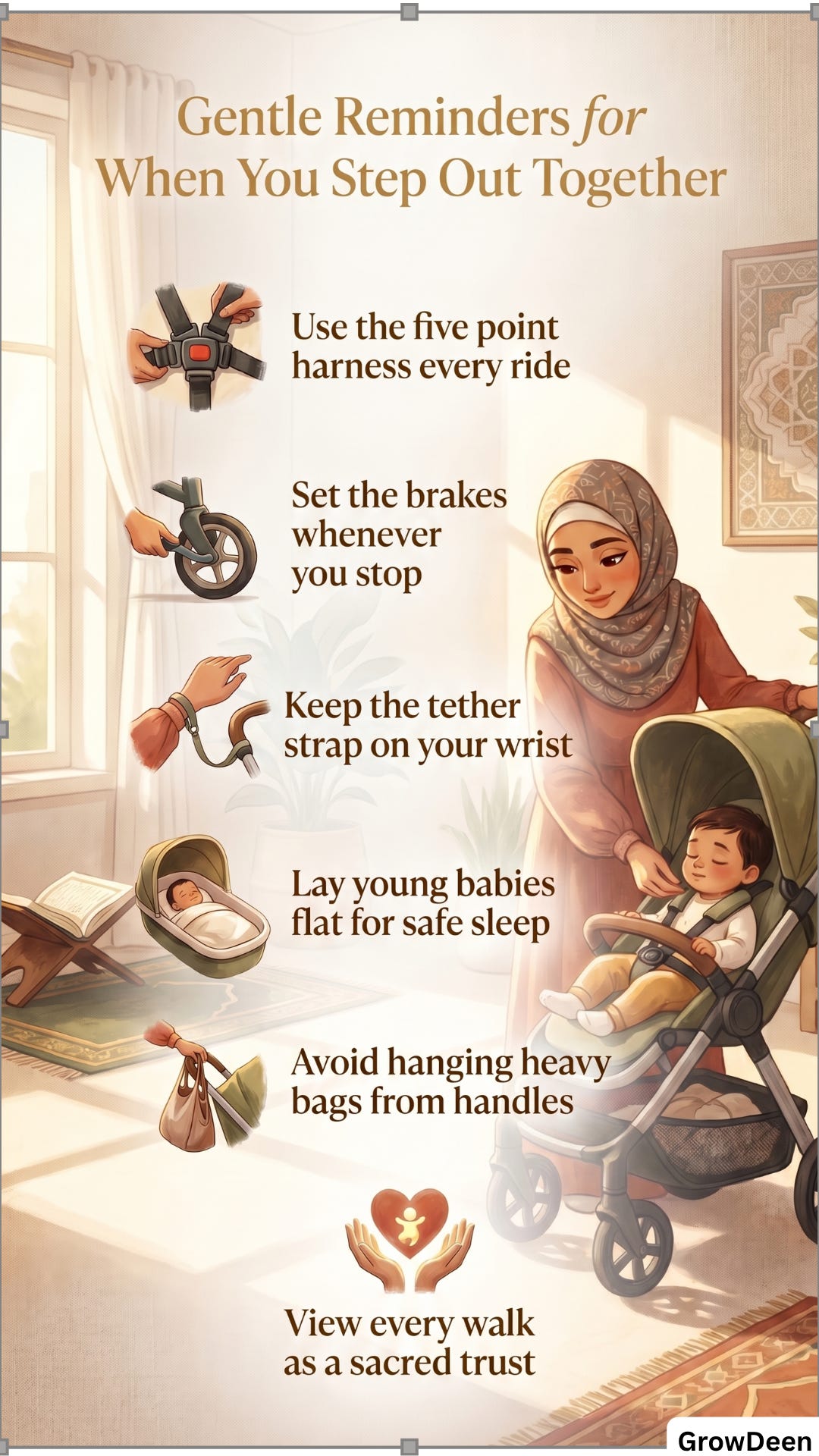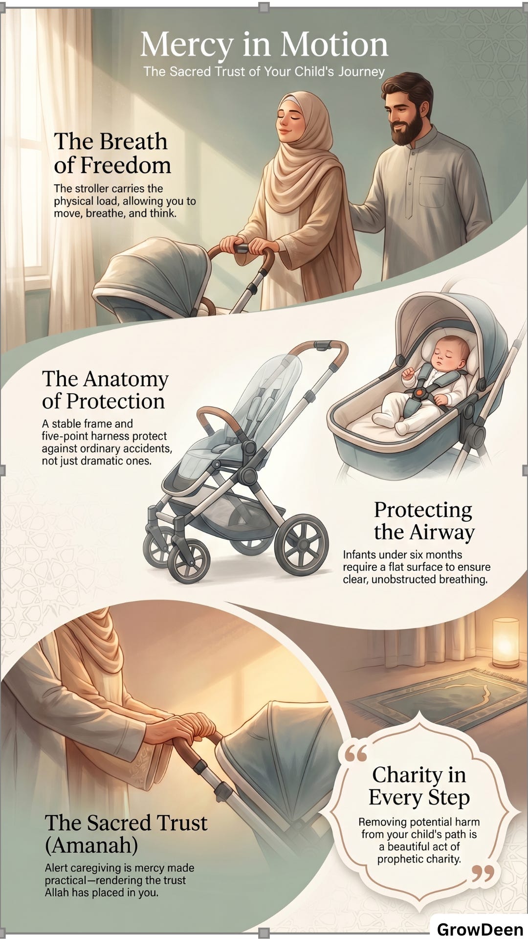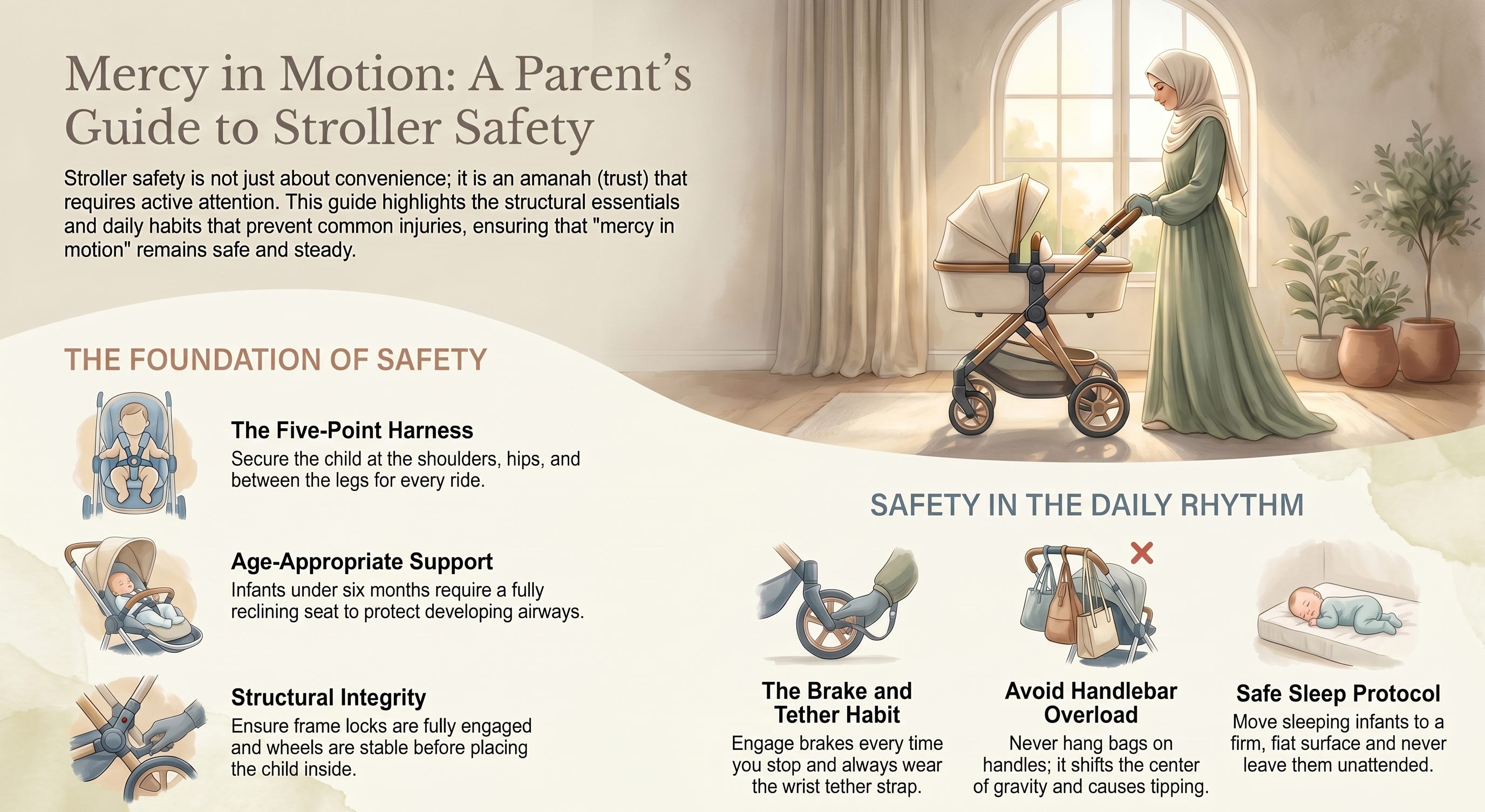 Even gentleness matters here. A stroller should not become a place where a child is left too long, strapped in carelessly, or handled roughly in the name of efficiency. Allah says, “And lower to them the wing of humility out of mercy.” [16]
