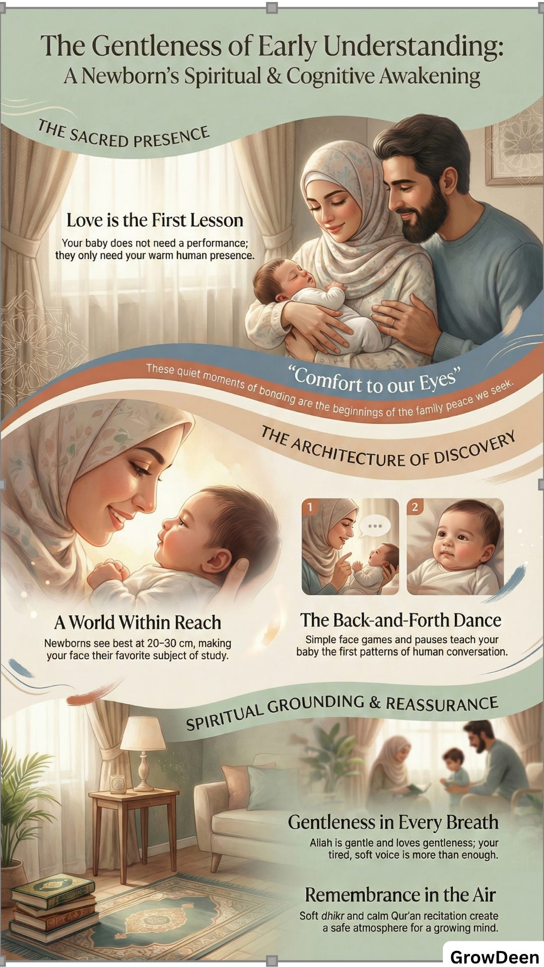 A baby arrives knowing nothing, yet already equipped by Allah with the beginnings of hearing, seeing, receiving, and learning. And Allah teaches believers to ask, “Our Lord, grant us from our spouses and our offspring comfort to our eyes.”[15] These early moments are part of that comfort.