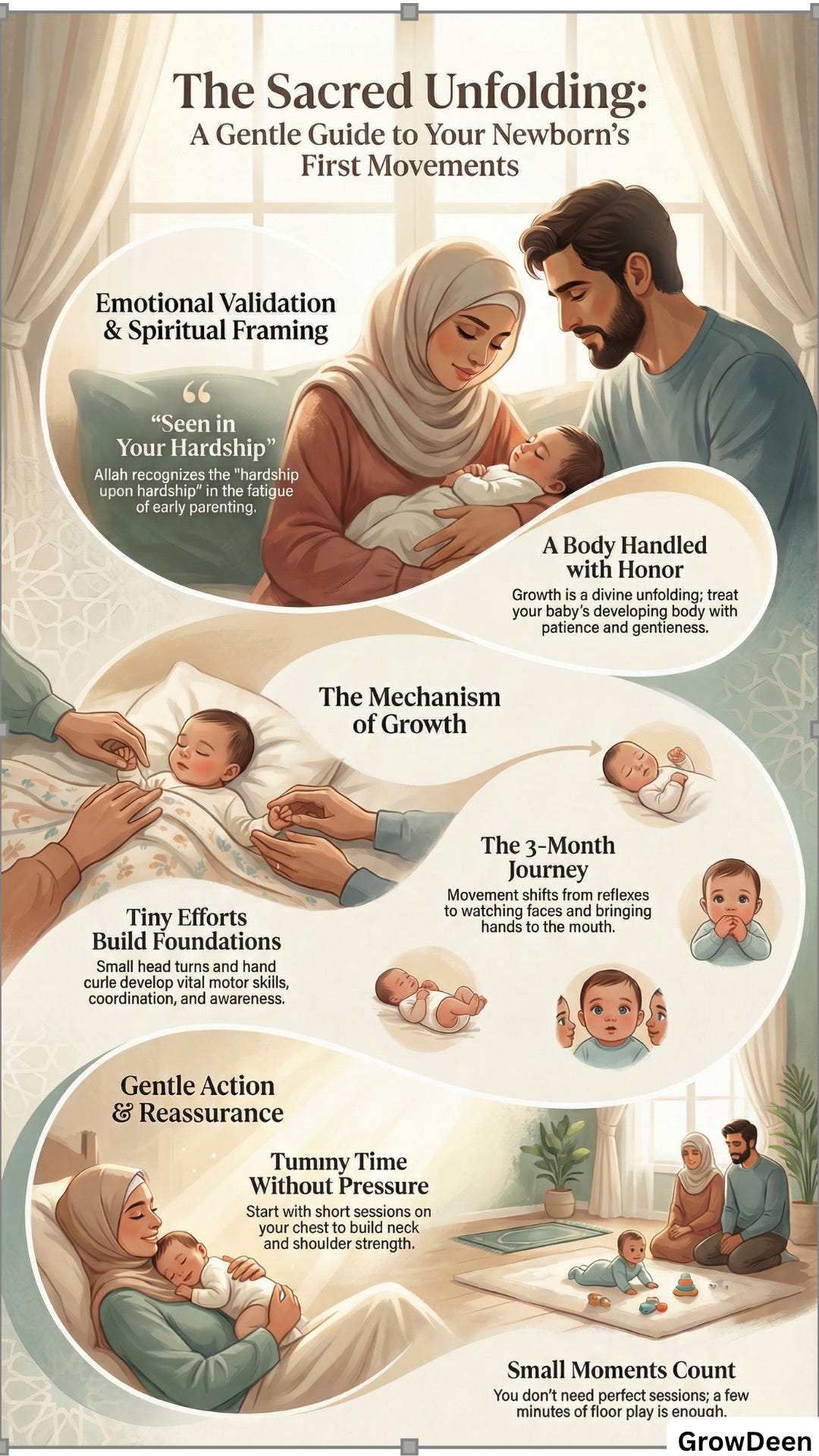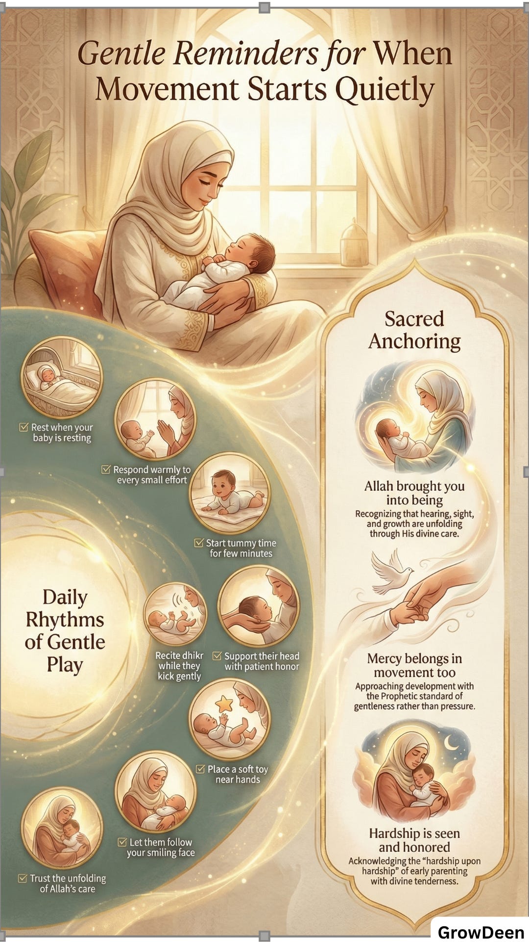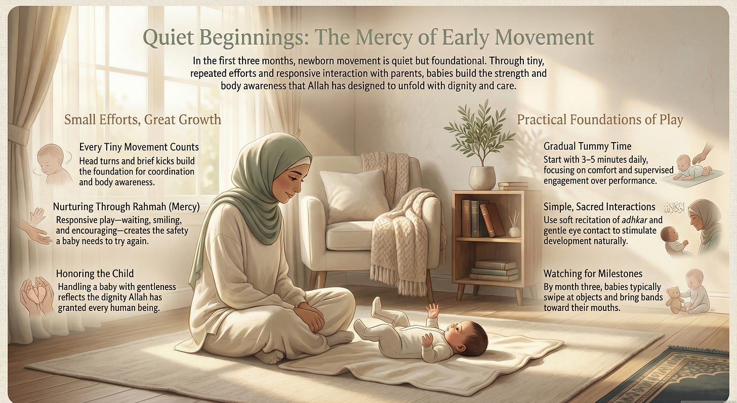 The Prophet ﷺ said, “Whoever is not merciful to others will not be treated mercifully.”[14] Newborn movement play should feel like that. Not rough. Not pressured. Not performance based. Just patient mercy repeated in small moments.